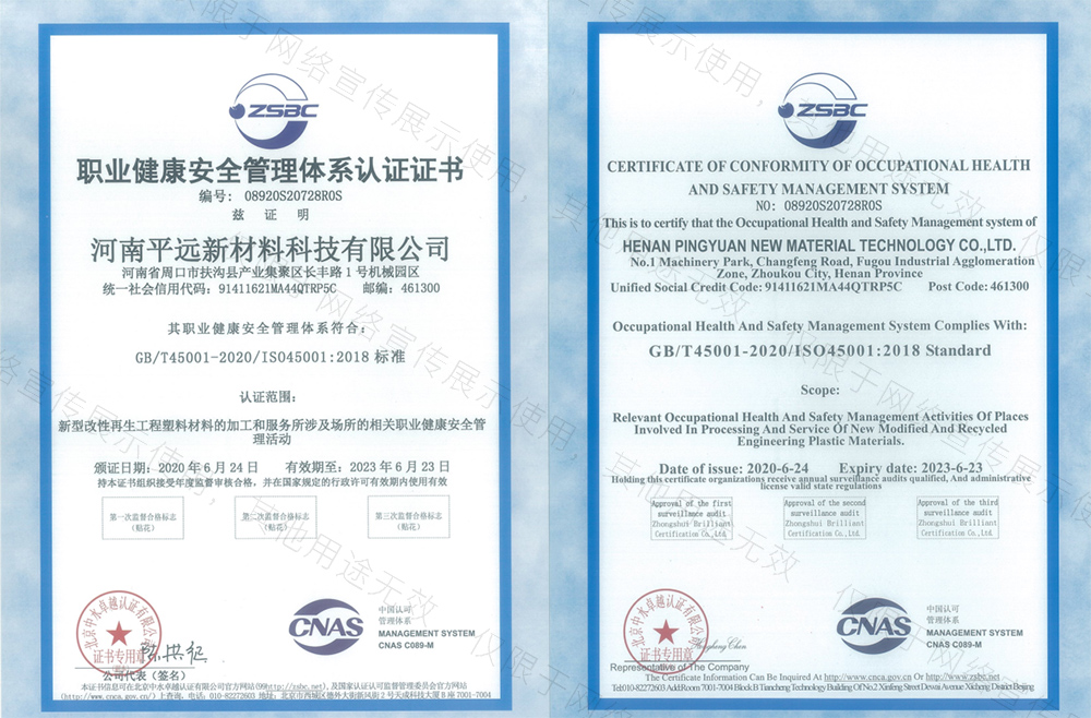 河南平遠(yuǎn)新材料科技有限公司生產(chǎn)基地坐落于河南省鄢陵縣先進(jìn)制造業(yè)開發(fā)區(qū),工廠占地10000平方米。公司通過GRS全球回收標(biāo)準(zhǔn)認(rèn)證、ISO9001質(zhì)量體系、14001環(huán)境體系和45001職業(yè)健康安全管理體認(rèn)證。華東分公司位于浙江省余姚市中國塑料城。